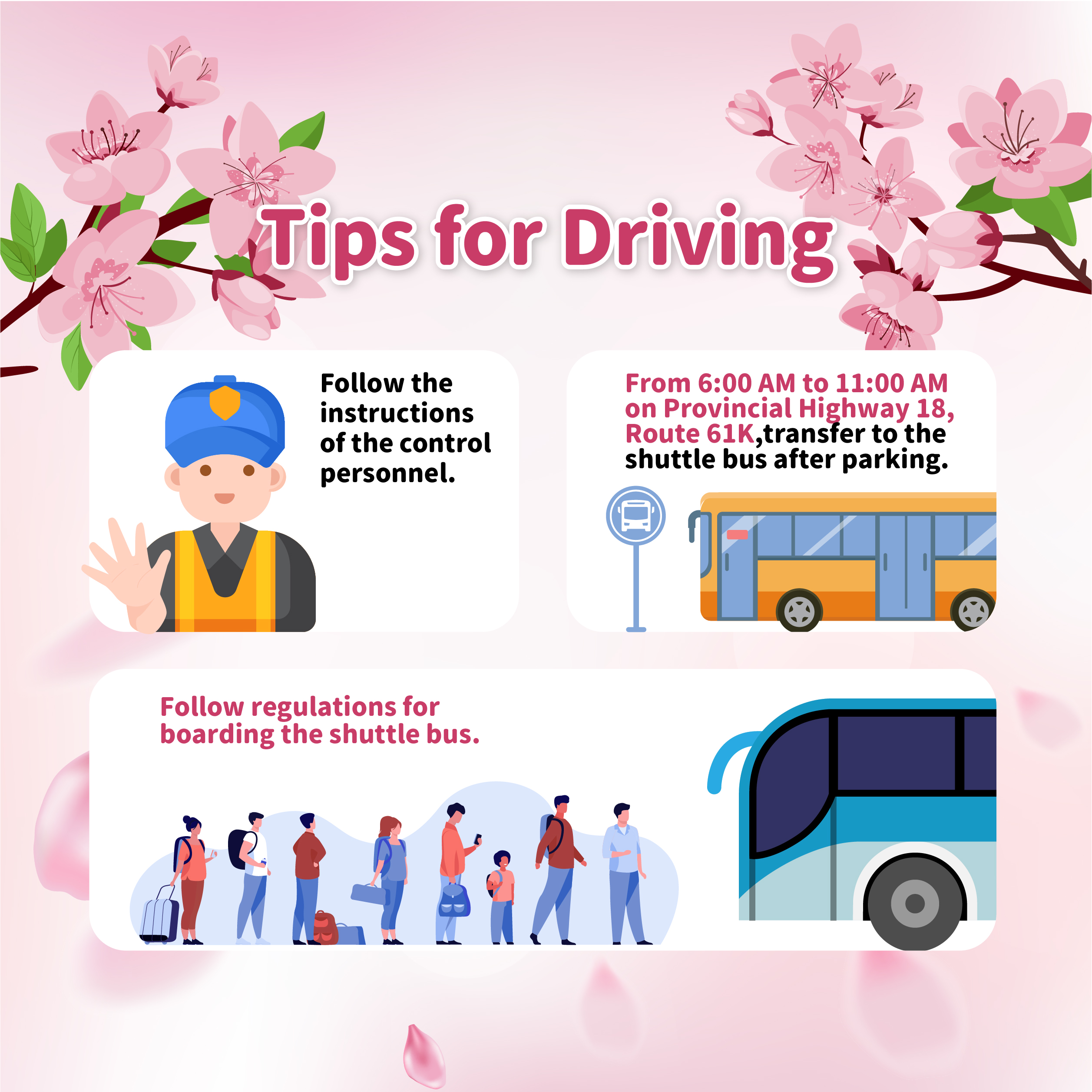 .花の季節のシャトルバスの発車時間を確認し、早めに乗車して最終バスで座席を確保してください。