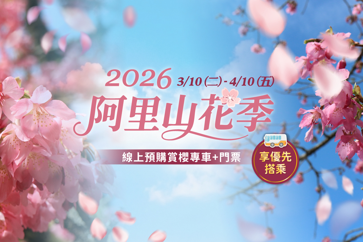 A1: 阿里山國家森林遊樂區花季為2026年3月10日至2026年4月10日,首先由山櫻花揭開花季的的序幕,接著日本品系櫻花,此時的森氏杜鵑、垂絲海堂、臺灣一葉蘭也陸續報到,此時的阿里山處處是花海。
