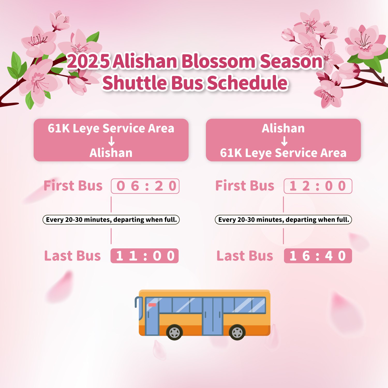 Please be aware of the shuttle bus departure times for the Blossom Season. Passengers are advised to arrive early to avoid missing a seat on the last bus.